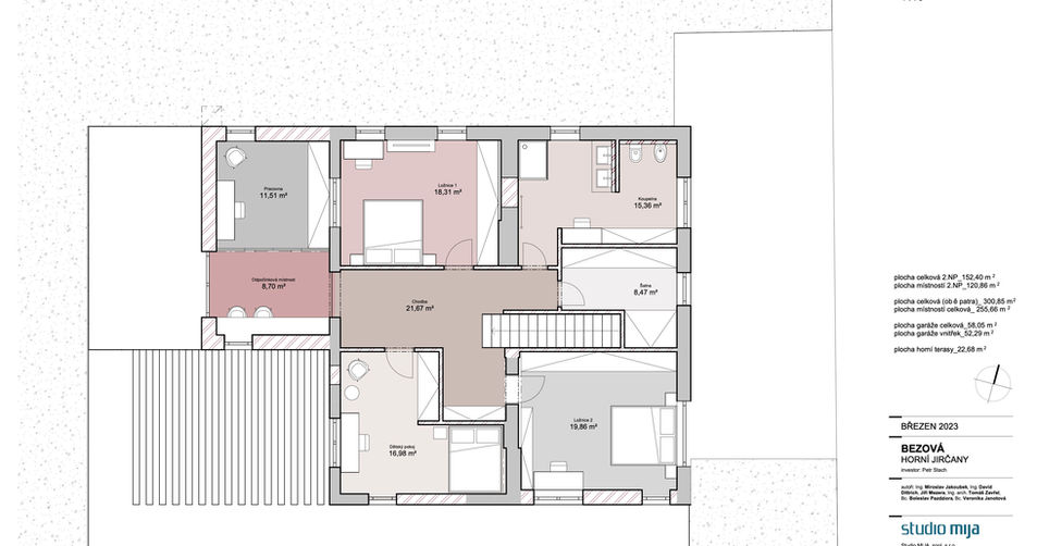 Rodinný dům je v projektu řešen velkoryse a prakticky: již zmiňované téměř 327 m² užitné plochy, dvě koupelny, prostorný obývací pokoj s terasou, technická místnost a garáž pro dvě auta. Dispozici lze samozřejmě upravit podle vlastních představ. Projekt využívá maximální možnou zastavěnost podle územního plánu – do limitu zbývají pouhé 3,1 m². Případné zmenšení je možné bez komplikací.